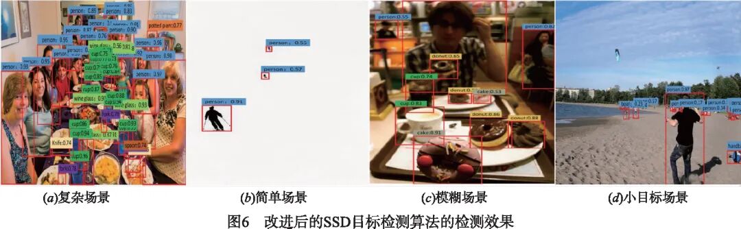 [size=1em]将改进算法的检测效果图与原算法的检测效果图进行对比,对比效果图如图5、6所示.改进后的SSD目标检测算法对输入图像中的中小目标能够更加精准的检测和分类,对由于遮挡现象造成的目标漏检问题有良好改善.在复杂场景中,与原SSD检测算法相比,改进的SSD目标检测算法能够检测到更多的目标;在简单场景中,改进算法对待检测目标类型的判别更加精确,目标的正确分类得分更高。此外,在处理模糊场景及小目标场景时,改进算法能够检测到更多的模糊目标与小目标。