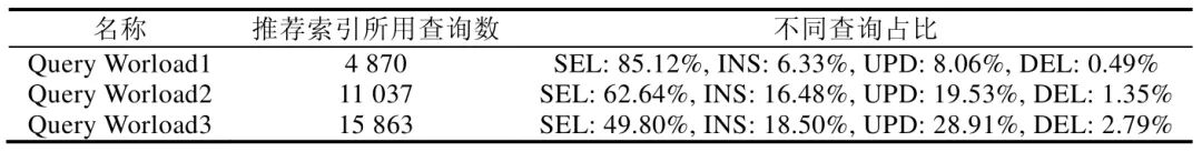 [size=1em]由于写查询(增删改)可能会导致索引的更新,因此不同的查询类型对于索引的查询优化效果会存在影响.为了测试不同查询集合对于参数调优的影响,第3 个实验采用OLTPBench 工具来产生查询日志并且进行性能测试(OLTPBench 可以通过调节事务比例来产生不同类别的查询).表4 所示为OLTPBench 产生的3 组不同的查询日志,3 组查询日志中包含的Select 查询占比分别为85.12%,62.64%与49.80%,其分别代表了读密集型查询、混合类型查询与写密集型查询.