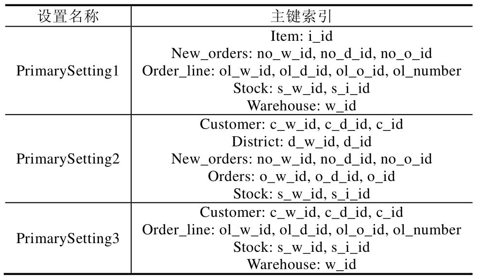 [size=1em]在默认条件下,TPCCMySQL 与OLTPBench 会根据TPC-C 实例信息来生成查询,并且生成查询的查询条件都可利用到对应表上的主键索引(在默认主键索引设置情况下,该工具产生的查询利用主键索引已经达到了最优的查询优化效果).因此,为了测试索引调优的效果,本文实验分别选择3 种主键索引设置下的场景,从而使得测试工具生成的查询可通过建立二级索引进一步的提升查询性能.表2 所示为TPC-C 数据库实例上的3 种不同的主键索引设置.