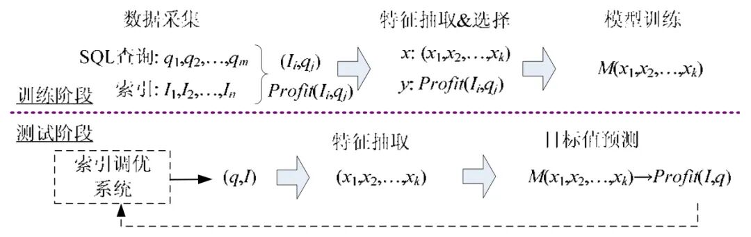 3.2 利用机器学习预测索引优化效果[size=1em]与许多现有利用机器学习的方法一样,本文的方法也分为两个阶段:训练阶段和测试阶段,如图5 所示.