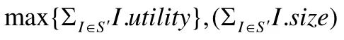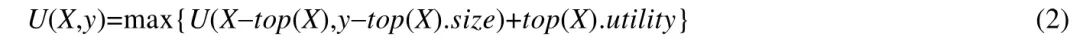 [size=1em]设X 为一组索引集合,y 为存储空间限制,U(X,y)表示在y 的限制范围内选取X 中索引可获得的最大的实用值.与0-1 背包问题类似,U(X,y)可以通过如下递归方式进行计算,其中,top(X)为集合X 中的第1 个索引: