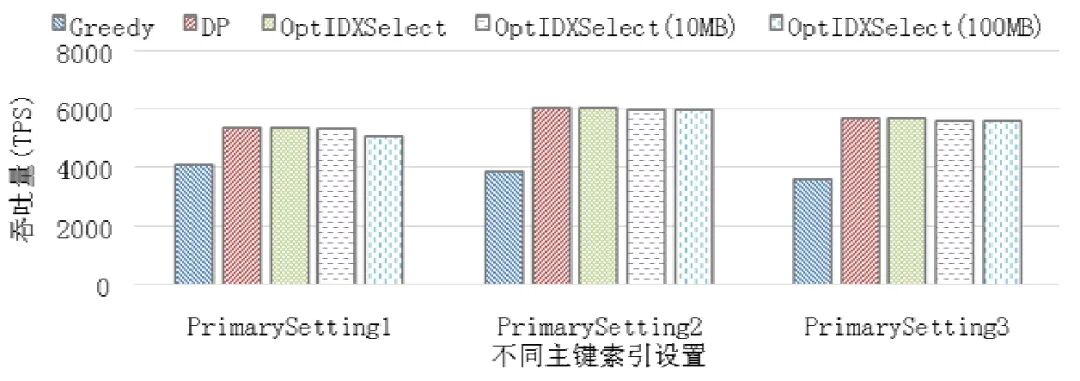 [size=1em]通过图8 实验结果可以发现,DP 与OptIDXSelect 所选择索引的优化效果要优于Greedy 方法所选择的索引.例如,在PrimarySetting1 下,Greedy,DP 与OptIDXSelect 选择的索引得到的吞吐量分别为4 113,5 377 与5 377.同时需注意到:DP 与OptIDXSelect 方法由于都是选择一组具有最大实用值的索引,因此它们得到的吞吐量是一致的.OptIDXSelect 算法在设置索引大小粒度gran 后,所选择的索引获得的吞吐量有所下降.这是因为设置gran的目的是加快索引的选择,但同时不能保证选择的索引取得最大的实用值.