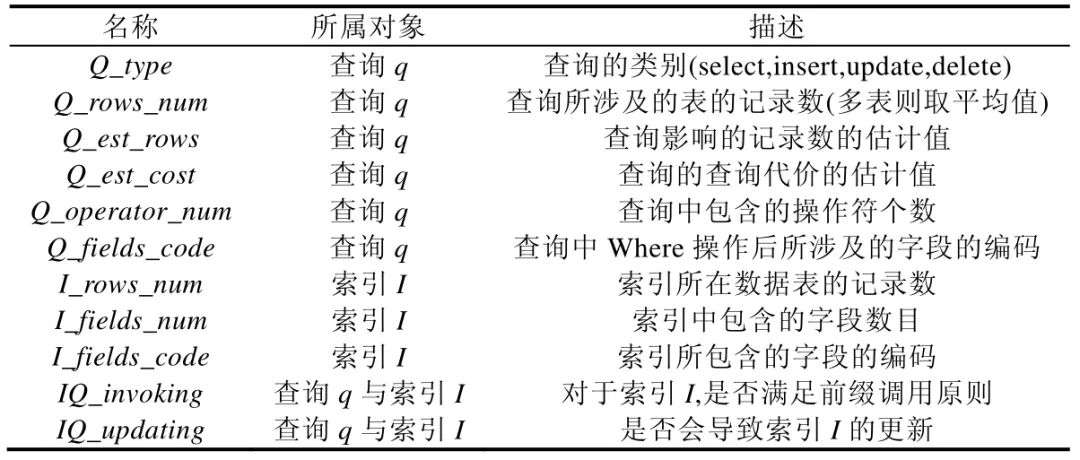 [size=1em]表1 中所示的特征属性都为查询编译阶段可获取到的属性值,特征属性可分为3 类,分别从查询q 与I 中获取到的属性与通过q与I 同时获取到的属性.其中,Q_type,Q_rows_num,Q_operator_num,I_rows_num,I_fields_num 均为调优系统在查询解析阶段可获取得到的属性值,Q_est_rows 与Q_est_cost 为通过数据库系统查询优化器可获得的属性值(例如MySQL 下的EXPLAIN 命令).相比之下,Q_fields_code 与I_fields_code 的获取则更为复杂,由于q 与I 所使用的字段信息都为字符串,为了得到可用作训练数据的数值型属性值,本文将数据库实例中的表中所有字段按照某一顺序进行排列,然后再将q 与I 中使用的字段按照该顺序进行One-hot 编码[22],则得到Q_fields_code 与I_fields_code.最后,由于在查询解析阶段可以比较判断:i)q 是否满足I 的前缀调用原则;ii)q中更新的字段是否包含了I 中的字段,因此可以获得IO_invoking 与IO_updating 这两个属性值.