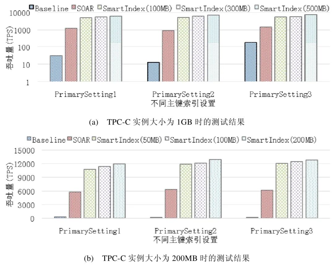 [size=1em]图6(a)所示为数据库实例大小为1GB 时,不同方法的对比结果.SmartIndex 分别测试了索引空间阈值设置为100MB,300MB 与500MB 时的调优效果.通过实验结果可以发现:相较于Baseline 方法,SOAR 与SmartIndex方法在索引调节后都取得了更好的查询性能,并且 SmartIndex 的索引调优效果要优于 SOAR.例如,在PrimarySetting1 下,系统在利用SOAR 方法调优后的吞吐量提升到了1 200.相较之下,经过SmartIndex(索引大小阈值B 设置为500MB)调优后,吞吐量则提升到了5 993.在大小为200MB 的数据库实例上也得到了相似的实验结果,如图6(b)所示.例如,在PrimarySetting3 下,经过SmartIndex(阈值B=500MB)调优后,数据库系统的吞吐量从190 提升到了12 778.由于图6(b)中的实验所用数据库实例要小于图6(a)实验中的实例,因此图6(b)中实验所获得的吞吐量要明显高于图 6(a)中的实验结果.另一方面,通过比较 PrimarySetting1,PrimarySetting2 与PrimarySetting3 下的实验结果可以发现,SmartIndex 在不同的主键索引设置下都具有很好的调优效果.