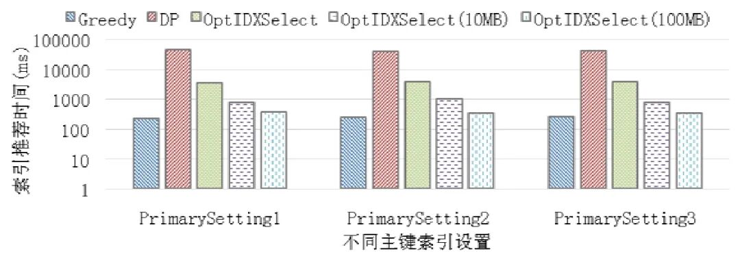 [size=1em]图9 进一步反映了各种方法在选择索引上的时间效率.显然,由于Greedy 使用了贪心策略,其选择索引花费的时间是最少的.比较DP 与OptIDXSelect 这两个可以取得最优解的方法,OptIDXSelect 的时间效率要明显优于DP.OptIDXSelect(gran=10MB)相比于OptIDXSelect 获得的吞吐量相差很小,但是其选择索引的效率却要远高于 OptIDXSelect 方法.例如,在 PrimarySetting1 下,Greedy,DP,OptIDXSelect,OptIDXSelect(gran=10MB)还有OptIDXSelect (gran=100MB)用于选择索引花费的时间分别为221ms,43792ms,3388ms,774ms 与367ms.虽然当前实验测试不同算法差距最大的也仅为43571ms,但在需要连续的通过查询日志进行索引调优,并且日志中包含大量查询的时候,选择高效的算法来完成索引选择仍非常重要.