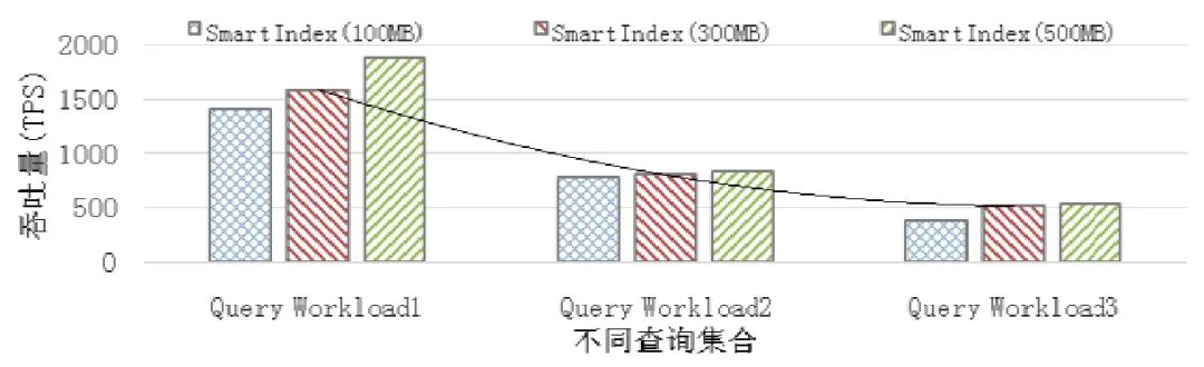[size=1em]图7 所示为利用SmartIndex 方法进行索引调优后(Baseline 为PrimarySetting1),通过OLTPBench 进行性能测试得到的实验结果(性能测试的查询类别比例与生成查询日志中的查询类别比例一致).随着写查询比例的增加,通过索引调优后的数据库系统的吞吐量是降低的.例如,SmartIndex(B=300MB)在query workload1 与query workload3 调优后得到的系统吞吐量分别为1 585 与518.出现这种现象的原因是:更多的写查询会增加索引的更新维护代价,从而降低了整体的吞吐量.此外,实验结果还显示:在写查询比例增加后,增大索引阈值所能提升的查询性能是降低的.这是因为在写查询比例高的时候,即使允许建立更多的索引,但由于索引更新维护代价的增加,SmartIndex 也无法选择出新的具有查询优化效果的索引.