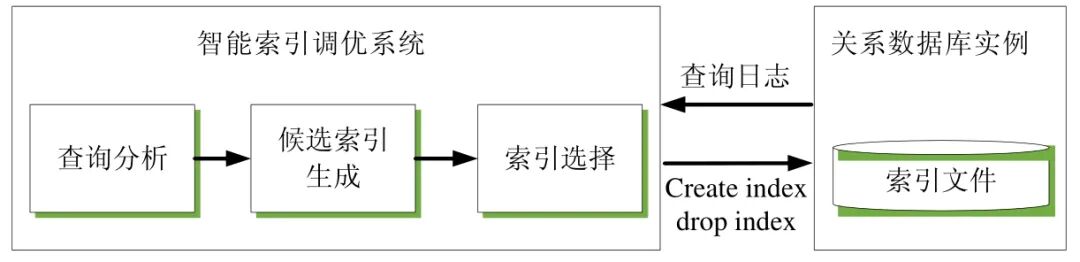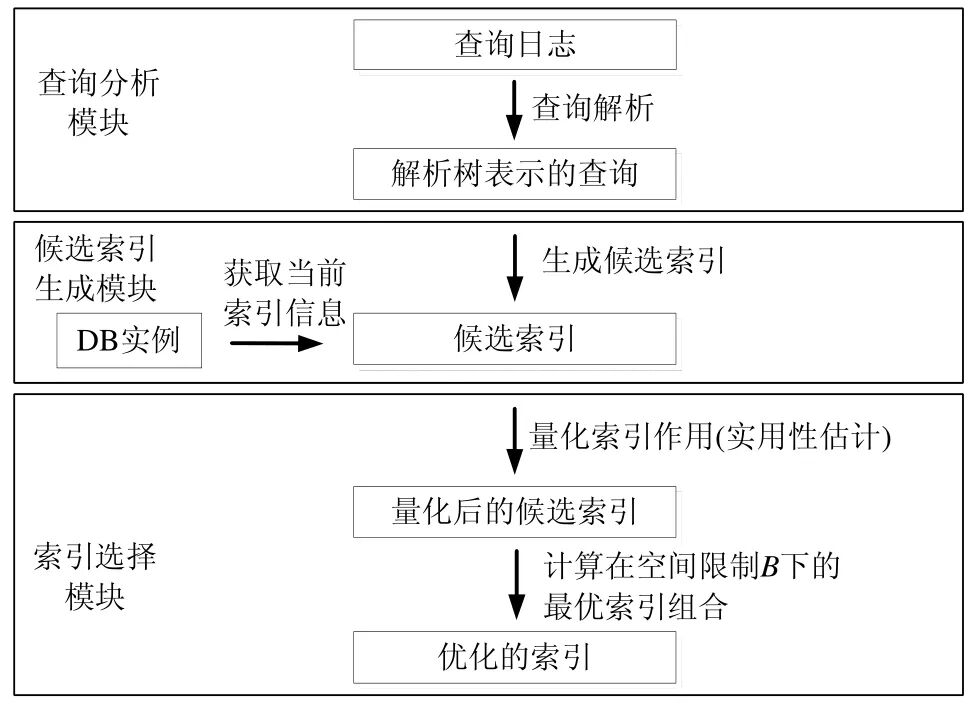 2 智能索引调优系统框架[size=1em]给定一个关系数据库的实例,智能索引调优系统利用该数据库实例上的一段时间窗口内的查询日志进行索引调优.调优系统包含了3 个模块,分别为查询分析模块、候选索引生成模块与索引选择模块.图1 所示为智能索引调优系统的总体框架.