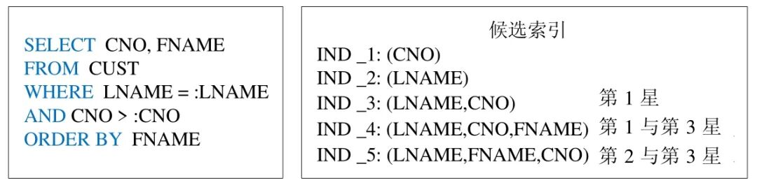 [size=1em]对于查询分析模块产生的属于同一个数据表上的字段集合,其任意字段的组合都可以作为候选索引.然而,并非对所有的字段组合建立索引都可以提升查询的性能.例如,对于图3 所示例子中获得的字段集合,在字段组合(FNAME,LNAME)上建立索引不会对示例查询产生查询优化效果(即,对于该示例查询,查询优化器不会调用该索引).因此,为了获得有效的字段组合,本系统利用文献[10]提出的索引等级评价标准(即三星标准),对于查询记录中的每一条查询,都产生满足其任意星级标准的字段组合.其具体内容如下.