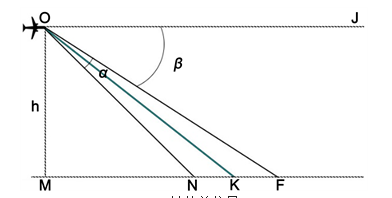 设无人机飞行高度为h、水平视角为λ (λ为图中的∠BOA)、垂直视角为α、俯视角为β,如图2所示。在AB边、PQ边和CD边上分别取它们的中点N、K、F,其中OK边是∠NOF的角平分线。网格的边长不能大于梯形的最长边CD,也不宜小于最短边AB,本文取梯形的中线PQ为网格的边长。