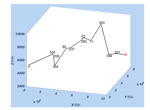 围绕在上述轨迹约束条件下,本文为智能飞行器建立航迹规划一般模型和算法。本文针对参考文献 [1] 中的数据,规划分别满足约束条件(1)~(7)和(1)~(8)时,飞行器运行的最优航迹。另外,飞行器的飞行环境可能随时间动态变化,虽然校正点在飞行前已经确定,但飞行器在部分校正点进行误差校正时存在无法达到理想校正的情况(即将某个误差精确校正为0),例如天气等不可控因素导致飞行器到达校正点也无法进行理想的误差校正。若假设飞行器在部分校正点(文献 [1] 中附件1和附件2中F列标记为“1”的数据)能够成功将某个误差校正为0的概率是80%,如果校正失败,则校正后的剩余误差为min (error, 5)个单位(其中error为校正前误差,min为取小函数),本文针对此情况重新规划航迹。