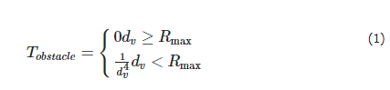 当飞行器未遇到障碍物时,危险度为0,飞行器的误差则与到障碍物中心的距离有关,距离越近越危险但误差相对小。(1)式中, RmaxRmax 是障碍物的最大半径, dvdv 是飞行器到障碍物中心的距离。