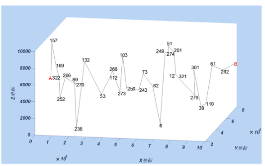 最后根据一、二两种方案设计出算法1和2,并根据通过软件实现后得出的结果,画出两个方面的两个数据集的航迹规划路径图,见图1~6,将结果(即飞行器从起点出发所经过的误差校正点编号,和校正前的误差)依次填入航迹规划的结果表中,见表1~8,并得出算法的时空复杂度,证明算法是有效可行的,见表9。
