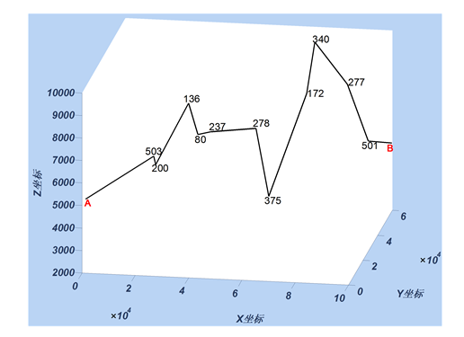 在给定初始点A到终点B条件下,为确保测量飞机从A点通过校正点到达B点的全程距离最小 [2]。设 titi 时刻,飞行器当前位置与可达域校正点的距离为 A(ti)A(ti) [3],结合约束条件,建立飞行器航迹规划模型: