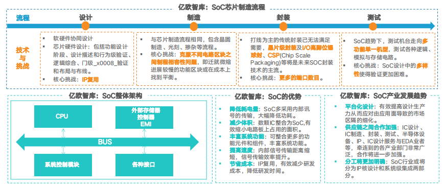 集成芯片。在一个芯片上实现信号的传输、存储、处理和I/O等功能,包含嵌入软件及整个系统的全部内容。由于高集成效能,SoC已经成为微电子芯片发展的必然趋势。