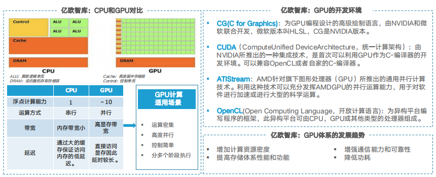 图形处理器最初是一种专门用于图像处理的微处理器,随着图像处理需求的不断提升,其图像处理能力也得 到迅速提升。目前,GPU主要采用数据并行计算模式完成顶点渲染、像素渲染、几何渲染、物理计算和通用计算等任务。因其超过CPU数十倍 的计算能力,已成为通用计算机和超级计算机的主要处理器。其中通用图形处理器GPGPU(GeneralPropose Computing on GPU)常用于数据 密集的科学与工程计算中。英伟达与AMD仍占据GPU霸主地位,2018年至今,国产GPU也积极发展中,已有部分产品落地。