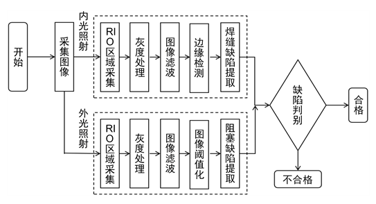 本检测算法系统主要分为两个检测模块,分别对焊缝缺陷以及阻塞缺陷进行检测。该系统通过对原始图像进行处理,提炼出其中的主要特征(轮廓、亮度等),便于计算机识别法 [10] [11]。首先,开启内光源对汽车散热器的钎焊处进行焊缝检测,判断其是否存在缺陷。然后,关闭内光源,开启外光源,对散热器钎焊处的阻塞缺陷进行检测,判断其是否存在缺陷。若两个模块都未检测出缺陷,则判定为合格产品,否则即为不合格产品。本文算法流程图如图5所示。