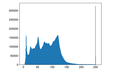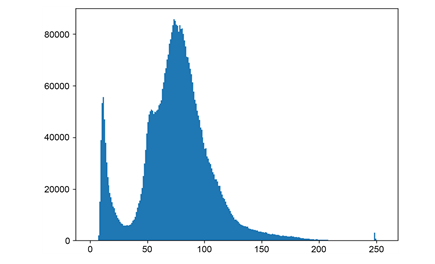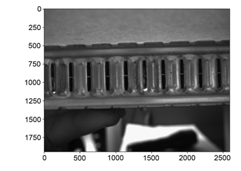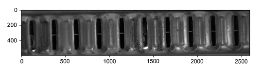 在对图像采集的过程中往往会因为相机视场较大出现目标以外的场景,而目标缺陷区域只存在于散热器钎焊处的图像中。因此,在进行图像处理以前,需要对散热器钎焊图像进行有效区域的提取。有效区域也可称为感兴趣区域(Regions of Interest简称ROI),去除背景无关部分,尽可能的保全散热器钎焊处的部分。图8为提取后的ROI图像,图9为ROI图像的灰度直方图。