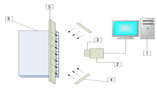 图4. 基于机器视觉的汽车散热器钎焊缺陷检测系统。1. 计算机;2. 相机;3. 镜头;4. 外光源;5. 内光源;6. 汽车散热器