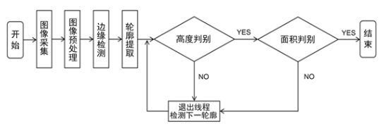 本文将采用双阈值筛选算法对阻塞缺陷进行提取。首先,经过改进的Canny边缘检测之后,可以清晰的将散热器钎焊处的边缘轮廓提取出来。其次,缺陷管口的轮廓在面积和长度方面都远远的小于正常管口。因此,本文结合轮廓的高度和面积设计了一种新的缺陷提取算法–双阈值筛选算法,该算法通过设置尺寸的阈值来筛选出缺陷的轮廓,算法流程图如图14所示。