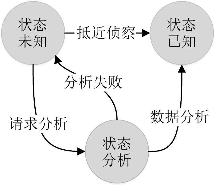 每个区域的状态分为状态未知、状态已知和状态分析3类,如图1所示。状态未知是指该区域还未被无人集群探索,确切价值尚不可知;状态已知是指该区域已经被无人集群探测过,已经查明了确切价值;状态分析是指该地区正在被无人集探测,无人集群正向指挥员请求数据分析。可以采用多种手段进行探测,不失一般性,无人集群主要有2种手段:①无人集群前往目标区域u进行抵近侦察,采用多个视角和多种传感器收集和处理数据,记为a'uau';②无人集群前往目标区域u进行高空侦察,并请求指挥员进行数据分析,记为a′′uau″。所有行动集合记为A={a'u,a′′u|u∈U}A={au',au″|u∈U}。