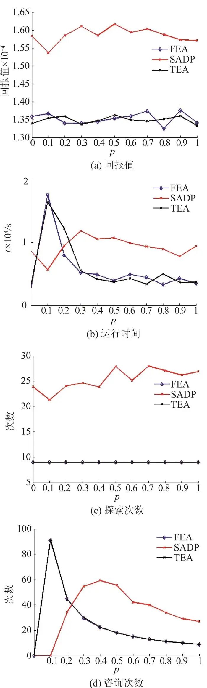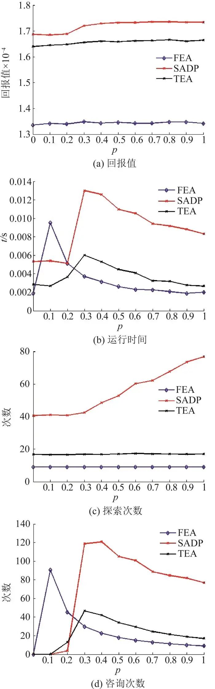 场景A2仿真结果如图3所示。实验结果表明在这些场景中SADP回报值远高于TEA,而TEA回报值高于FEA。SADP运行时高于FEA和TEA。SADP探索次数明显大于FEA和TEA的探索次数。当p>0.2时,SADP咨询次数大于FEA和TEA咨询次数。