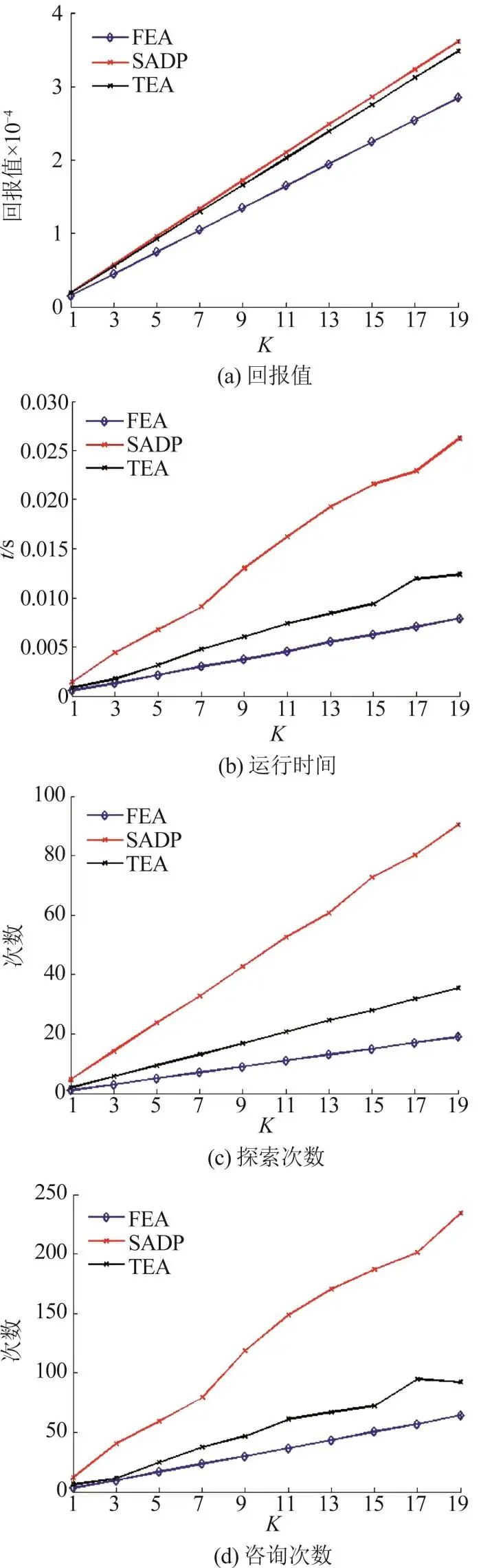 场景B仿真结果如图5所示。实验结果表明随着|K|K的增加,所有算法的回报值、运行时间、搜索次数、咨询次数都逐渐增加。此外在这些场景中,SADP回报值、运行时间、搜索次数、咨询次数高于TEA,而TEA又高于FEA。