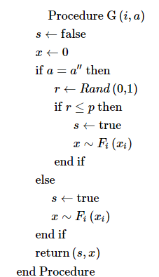 在仿真程序G中,如果采取行动a′′a″,则将生成的随机数r与咨询成功率p对比,以判断能否咨询成功。另外,符号“~”表示采样,x∼Fi(xi)x∼Fi(xi)表示对概率分布Fi(xi)Fi(xi)进行一次采样。