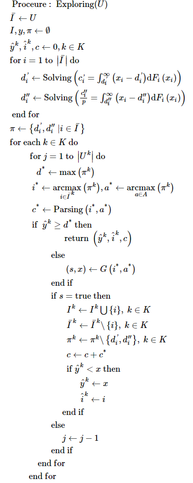 2.2 规划算法 在探索程序中,首先根据式(6)和(7)计算所有方案所有行动的决策指标,并保存至集合ππ中。其次嵌套遍历所有Agent k∈Kk∈K和每个Agent的未知方案空间UkUk。在嵌套遍历中,应先找出集合ππ中最大指标 d* d*,以及对应的方案i*i*、行动a*a*和代价c*c*。为了便于描述,指标集合是以全集为基础计数,而不以每个Agent的局部集合计数,即π={d'i,d′′i |i∈I¯}π={di',di″ |i∈I¯}。如果最大采样价值大于最大决策指标yˆk≥d*ŷk≥d*,则停止搜索并返回最大采用价值yˆkŷk、最终方案iˆkîk和累积搜索代价;反之则进入仿真程序G,获取是否咨询成功s∈{True, False}s∈{True, False}以及采样价值x。如果获得确切采样价值,那么更新集合IkIk、I¯kI¯k、πkπk和累积搜索代价cc。